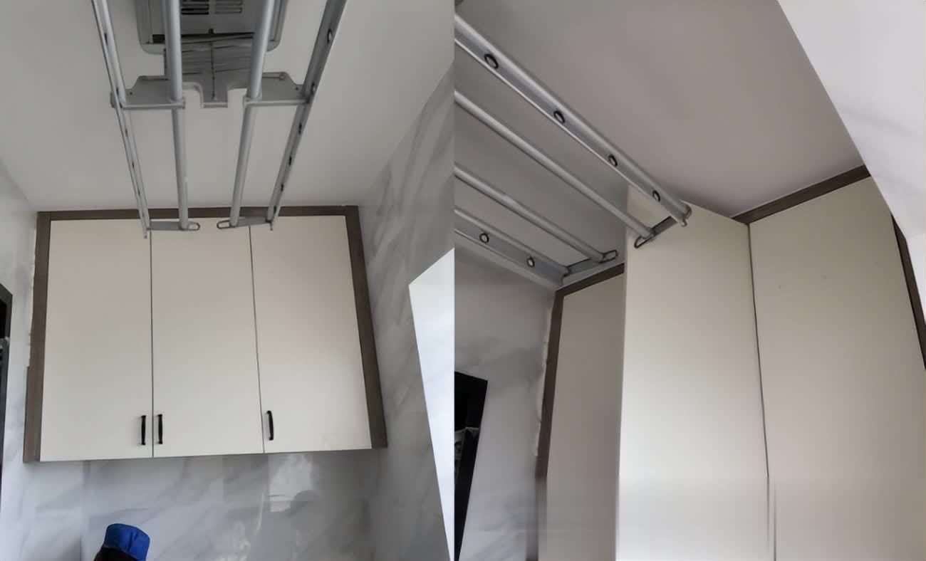 ▲柜子与晾衣架问题:您确定是柜子的问题?有人建议上头做个固定隔板,那多丑啊。电动晾衣架要买两边能收缩的,平时开门缩回来就行。明知距离有限还买固定的,要开门也行,降到吊柜下就行。若要完美,要不别做柜子,要不买可伸缩的晾衣架。